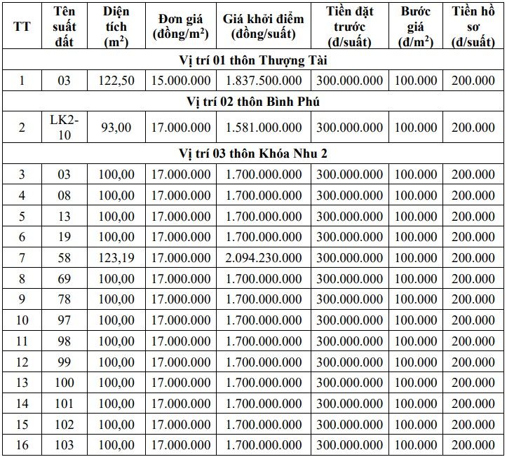 La superficie totale de la vente aux encheres est de 2 138 69 m2 ; chaque lot de terrain a une superficie de 93 m2 a 123 19 m2. Le prix de depart pour chaque lot de terrain varie de 15 a 17 millions de VND/m2 soit environ 1 a 2 milliards de VND/lot. Le prix de depart total de l'actif est de 36 112 730 000 VND hors taxes frais et autres obligations financieres connexes.