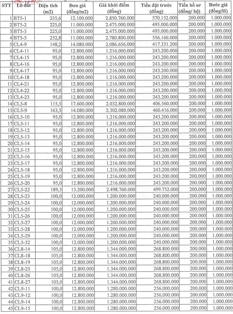 La superficie des parcelles de terrain varie de 95 a 300 m2. Le prix de depart pour les parcelles de terrain est de 10 2 a 17 6 millions de VND/m2 soit l'equivalent de 1 a 3 milliards de VND/lot de terrain. Le prix de depart est fixe a 1 000 000 VND/lot de terrain.