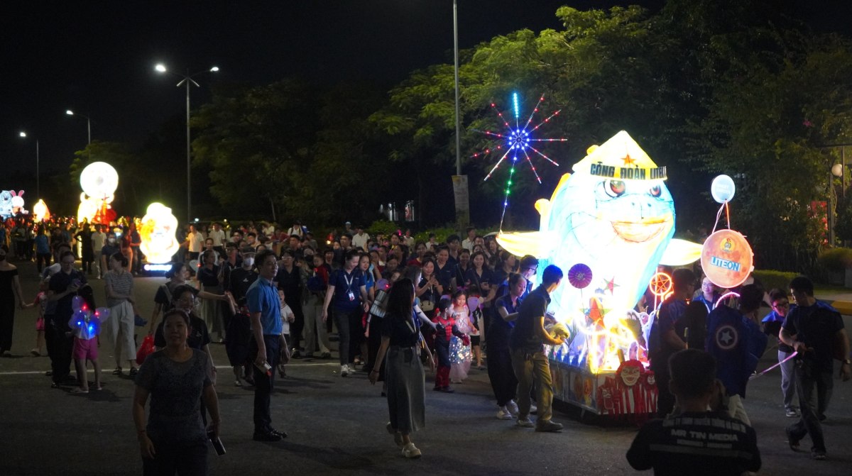 Participant a la soiree de festival des milliers d'ouvriers et de travailleurs des zones industrielles ont egalement assiste au defile de lampes de poche creatives de technologie de lumiere realise par les syndicats de base. Parallelement a cela des spectacles culturels et des representations de danse de lion de dragon de cirque et de magie speciales ont apporte une atmosphere animee de joie et de rires aux travailleurs pendant le Tet Trung thu 2025.
