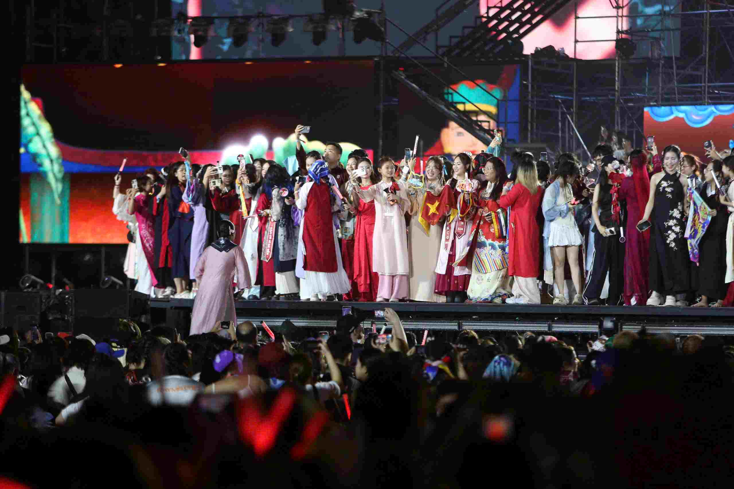 Lorsque la chanson "Un tour du Vietnam" a retenti, les organisateurs ont invité de manière inattendue des centaines de spectateurs en costumes traditionnels à monter sur scène pour chanter ensemble.