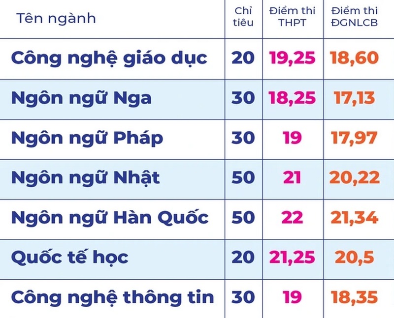 L'ecole selectionne les candidats sur la base des resultats des 3 matieres de l'examen de fin d'etudes secondaires de 2025 en utilisant les resultats des etudes secondaires de 2025 combines aux notes de l'examen d'evaluation des competences specialisees de 2024 et 2025. Les notes d'admission pour chaque filiere sont indiquees dans le tableau suivant :