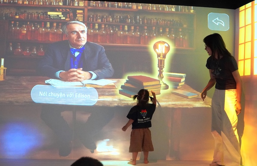 Qui etes-vous?' - a pose la question un jeune enfant d'environ 3 ans. Ce qui est special c'est que la personne qui a pose la question est le celebre scientifique Thomas Edison. Dans l'espace virtuel avec une seule touche de la main du jeune enfant lorsque la question est posee l'image du celebre scientifique mondial repond : 'Je suis un inventeur et aussi un homme d'affaires. J'ai invente de nombreuses machines...'. Les questions se poursuivent les jeunes enfants en dessous ecoutent attentivement