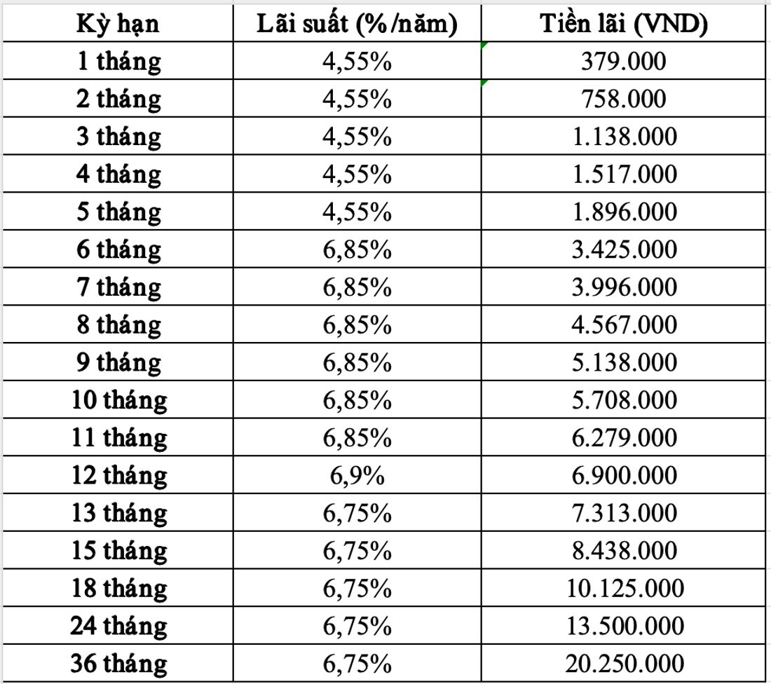 Ainsi, en déposant 100 millions de VND chez Bac A Bank, les clients peuvent recevoir le taux d'intérêt le plus élevé comme suit: