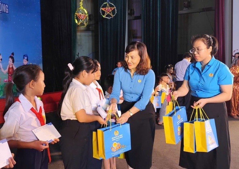 Comme chaque annee pendant la saison de l'automne-hiver de cette annee la Federation du travail (LDLD) a offert plus de 3 200 cadeaux (chaque cadeau coûte 300 000 VND dont de l'argent liquide et des biens materiels d'une valeur totale de pres d'un milliard de VND) aux enfants des membres du syndicat et aux travailleurs en difficulte. Non seulement il y a des cadeaux et des gateaux mais la soiree festive est aussi un terrain de jeu au vrai sens du terme pour les jeunes enfants : le son du tambour de lune
