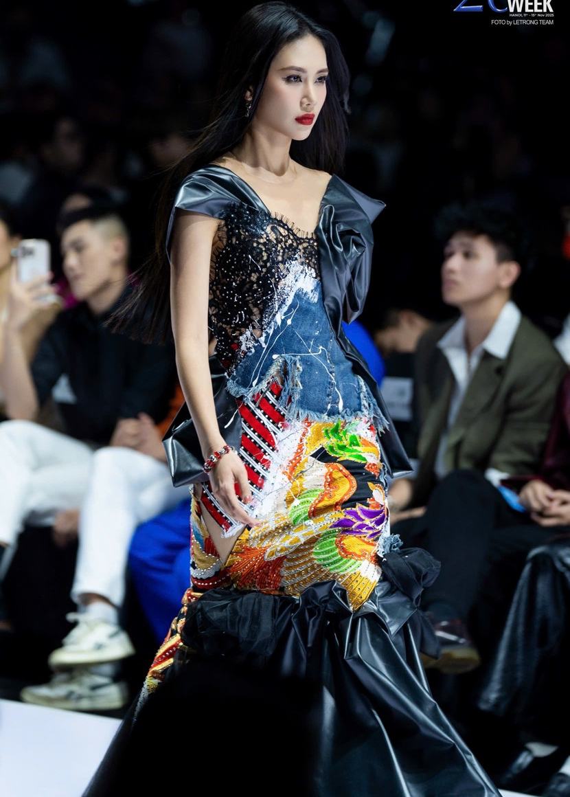 Le design de Cao Minh Tien pour vedette impressionne par sa structure recreee a partir de denim combinee a l'argile brodee a la main et a la broderie artisanale. La partie du role sculpte est de nature sculpturale contrastee avec le velours leger sur la jupe creant un effet de mouvement doux tout en conservant le drame necessaire. Lors de sa performance Bui Quynh Hoa a montre une harmonie parfaite entre la tenue l'attitude et l'histoire que la collection transmet.