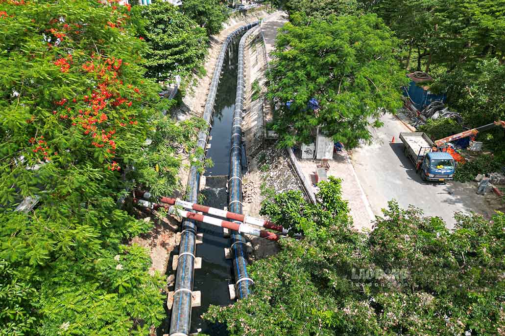 Cette source d'eau est conduite par un canal prive de pres de 1 5 km de long d'un diametre de 1 2 m a partir de la porte A du lac Tay en suivant le canal actuel de la rue Cong Do a travers l'allee 24 Vo Chi Cong puis au debut de la riviere To Lich.