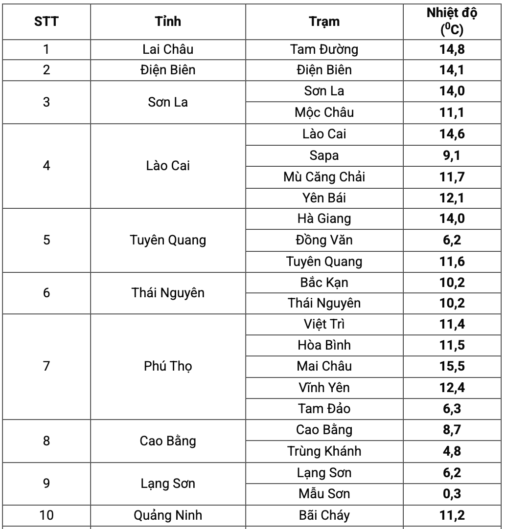 Les regions montagneuses et montagneuses sont tres froides, Mau Son (Lang Son) seulement 0,3 degre C, Trung Khanh (Cao Bang) 4,8 degres C, Dong Van (Tuyen Quang) 6,2 degres C, Tam Dao (Phu Tho) 6,3 degres C, Sa Pa (Lao Cai) 9,1 degres C. D'autres endroits dans les regions montagneuses du Nord comme Moc Chau 11,1 degres C, Mu Cang Chai 11,7 degres C, Yen Bai 12,1 degres C.