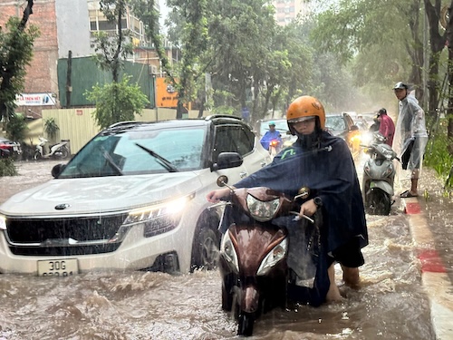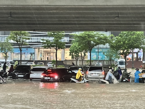 Tran Duy Hung Street est profondement de l'intersection avec Hoang Dao Thuy a Big C Thang Long. Photo: a laLes motos et les voitures a bas regime qui passent sont toutes en panne. Actuellement le point d'inondation est plus haut que la taille des adultes. Photo : To The