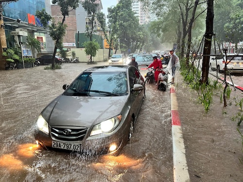 Hanoï forte pluie de nombreuses rues transformees en rivieres des vehicules tournant en ondes d'eau se deplaçant