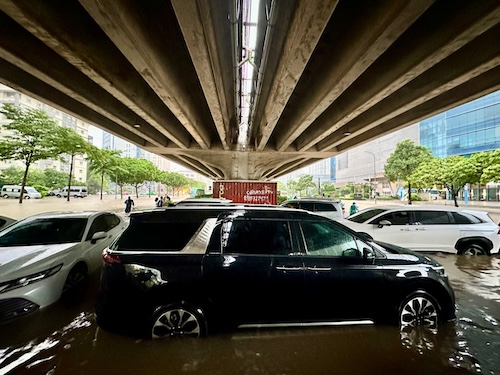 Le long de la rue Khuat Duy Tien a Hanoï les eaux sont profondement inondees et debordent dans les tunnels de stationnement des magasins et des maisons des deux cotes de la route. Photo : Bich Ha