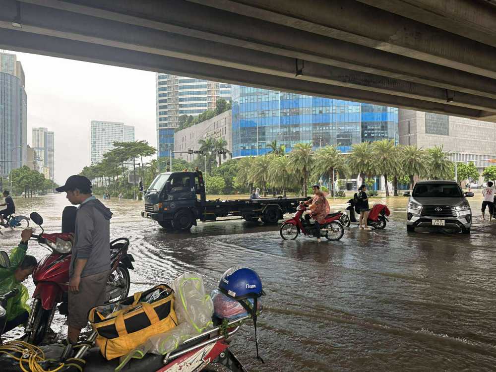 La zone de la rue Huynh Thuc Khang (tronçon de la station de radio et de television de Hanoï) a de nombreux tronçons d'eau profondement inondes sur la moitie des roues. Photo : Ngoc TrangLa zone urbaine Handiresco Pham Van Dong est inondee jusqu'a 50 cm de profondeur les habitants et les vehicules ne peuvent pas se deplacer. Photo : Ngoc TrangLa zone du parc Cau Giay est profondement inondee. Photo : Luong HanhLa zone de Tay Mo est profondement inondee de nombreuses voitures sont en panne alors qu'elles essaient de traverser les zones inondees. Photo : Hai Nguyen