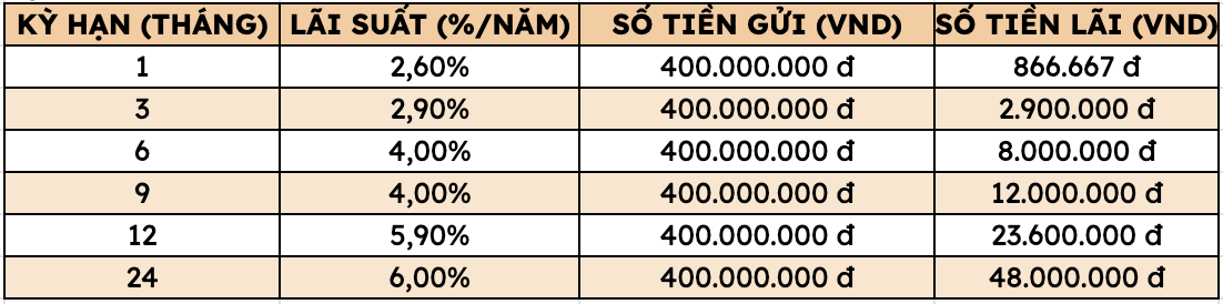 Ainsi, en déposant 400 millions de dongs à Agribank, les clients peuvent recevoir le taux d'intérêt le plus élevé comme suit (applicable aux clients particuliers déposant directement au guichet):