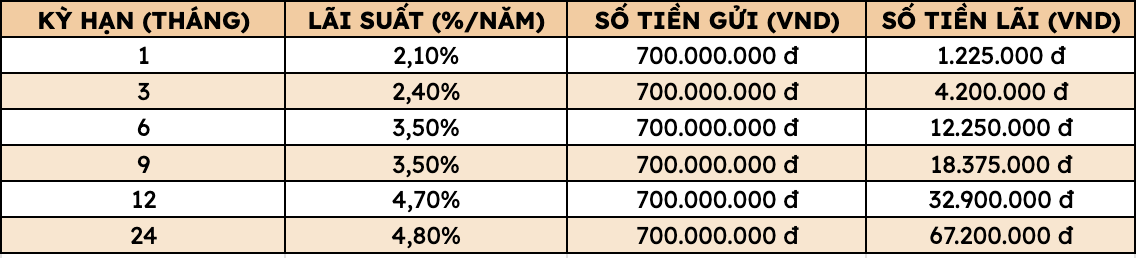 Ainsi en déposant 700 millions de VND chez Agribank les clients peuvent recevoir le taux d'intérêt le plus élevé comme suit (application aux clients individuels déposant directement au guichet) :