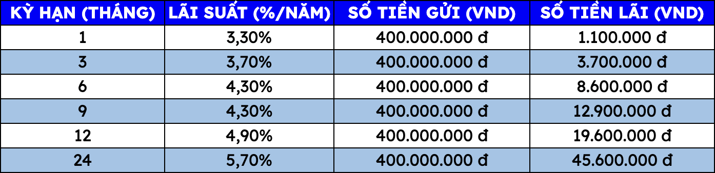 Ainsi en deposant 400 millions de VND chez MBBank les clients peuvent recevoir le taux d'interet le plus eleve comme suit (applicable aux clients individuels payant les interets ulterieurs) :
