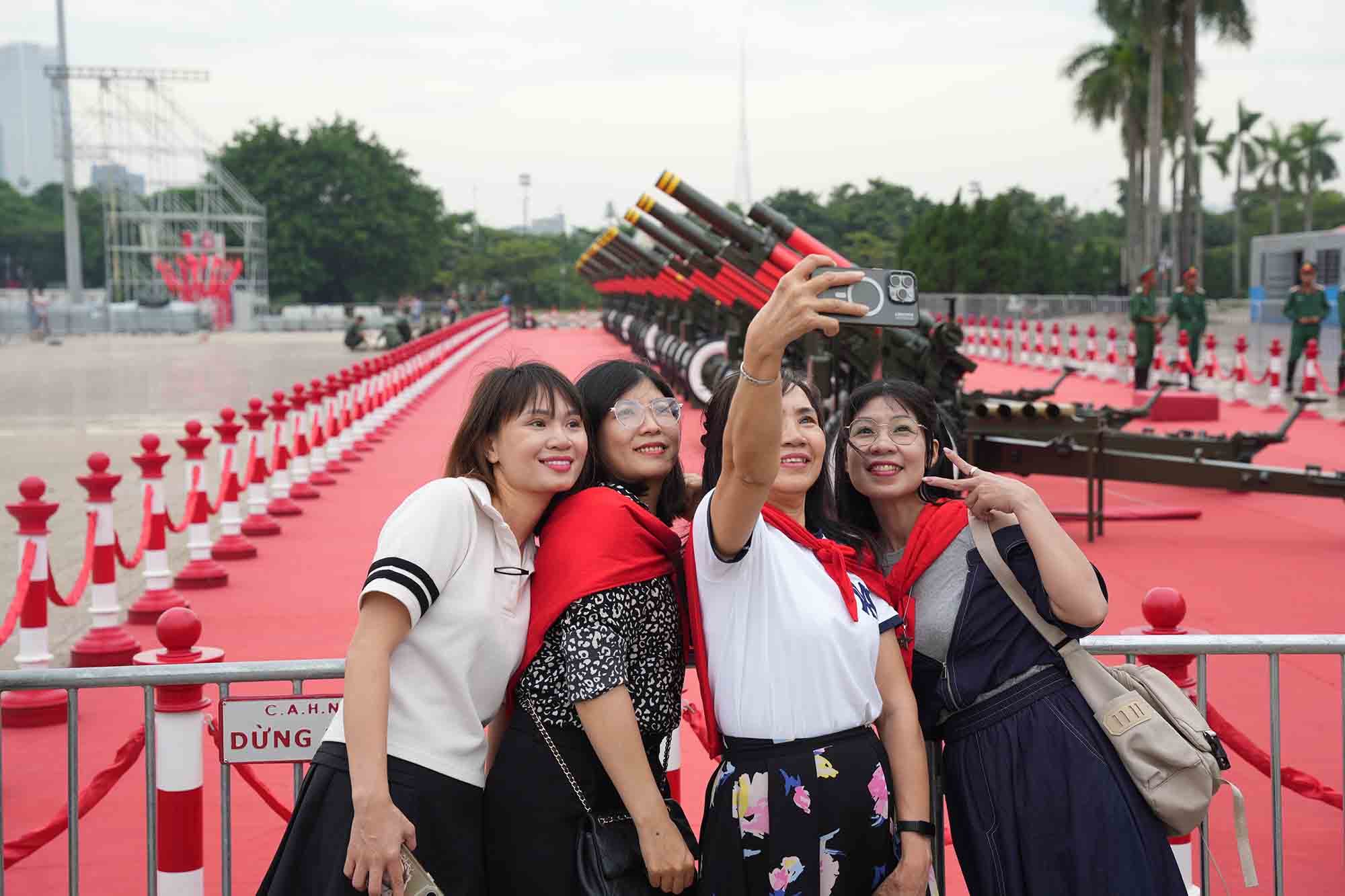 Des habitants de partout affluent sur la place Ba Dinh (Hanoï) pour attendre avec impatience la repetition du defile militaire et le defile A80.