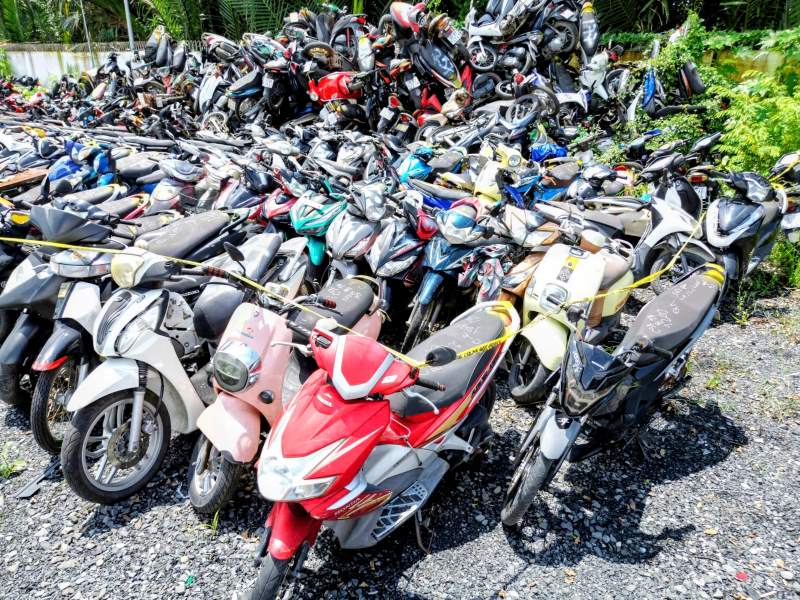 Selon les observations des journalistes parmi plus de 1 200 motos vendues aux encheres de nombreuses ont encore des plaques d'immatriculation des numeros de chassis et des numeros de moteur mais sont toutes gravement endommagees. Auparavant les autorites ont fixe l'evaluation de chaque moto de 370 000 VND a plus d'un million de VND.