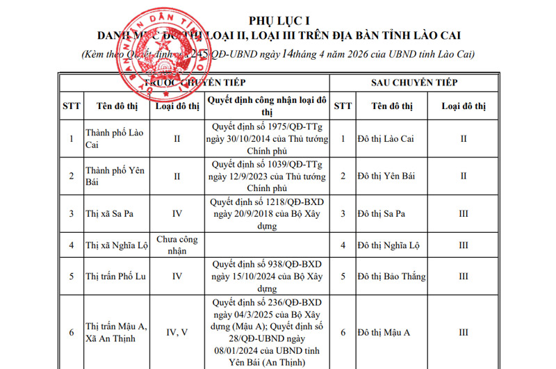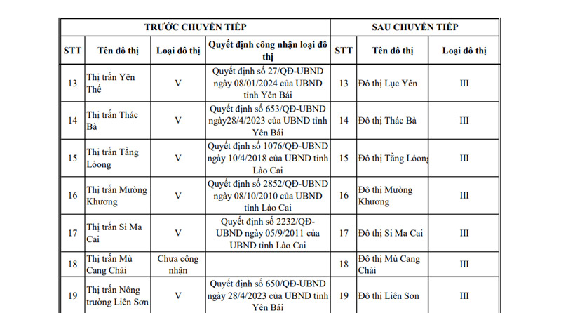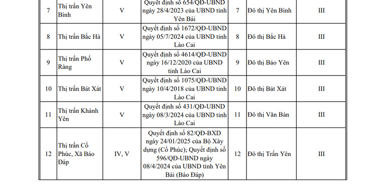 Selon la liste approuvée, toute la province compte 2 villes de type II, Lào Cai et Yên Bái, ainsi que 23 villes de type III.