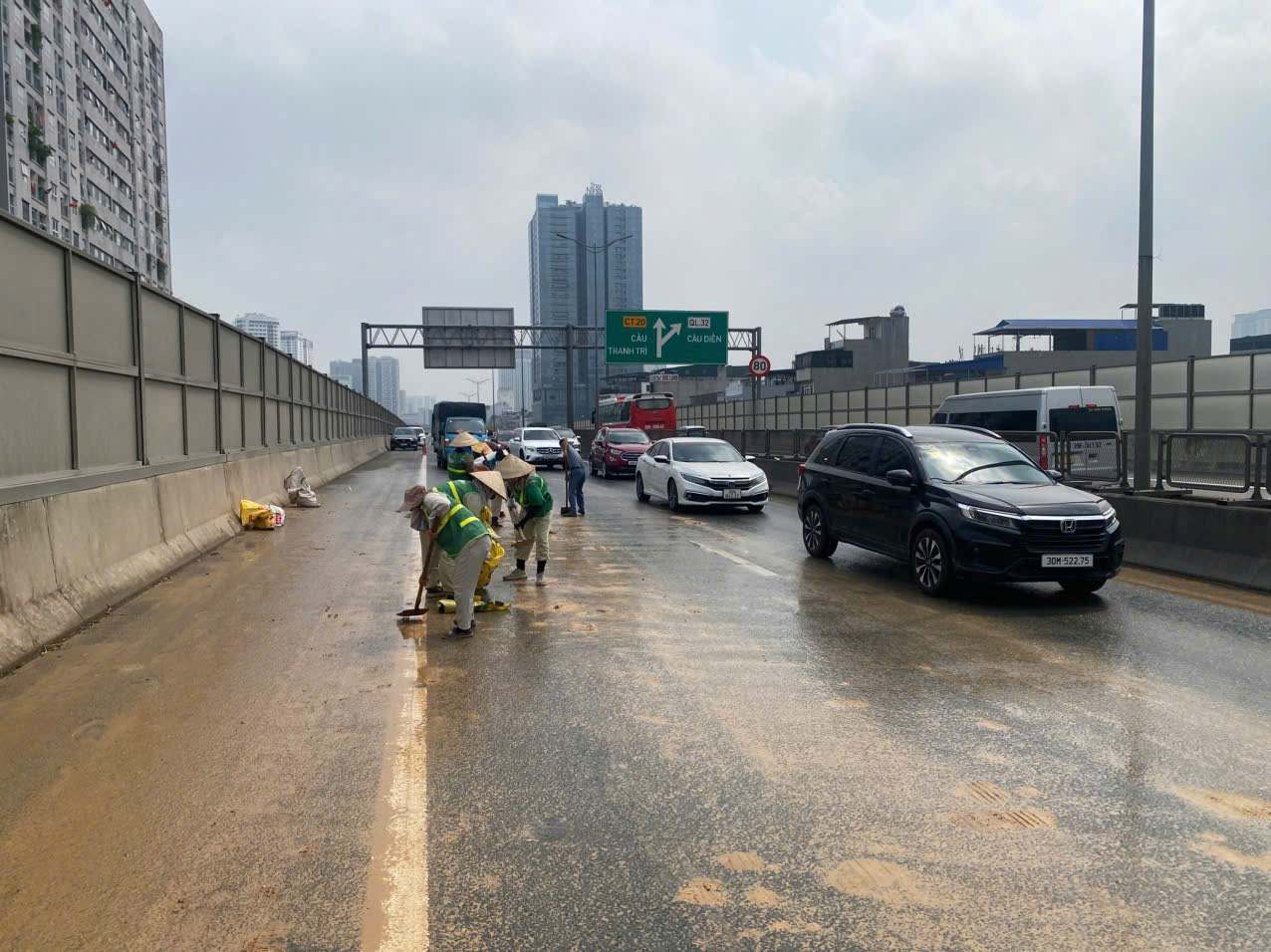 En conséquence, vers 11h25 le 29 mars, un groupe de travail de l'équipe de police de la circulation routière n° 6 (CSGT) - Département de la police de la circulation de la ville de Hanoï, dirigé par le lieutenant Le Thanh Hai en tant que chef de groupe, a découvert un camion-remorque immatriculé 24H-014. xx tirant une semi-remorque immatriculée 24R-014. xx déversant une grande quantité de boue et de terre sur la chaussée, ce qui présente un risque potentiel d'accident pour les véhicules circulant dans le même sens.