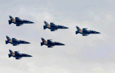 L'equipe d'avions Su-30MK2 a largue de brillantes balles dans le ciel avec les escadrons de l'armee de l'air lors du defile militaire general et du defile commemorant le 80e anniversaire de la fete nationale.