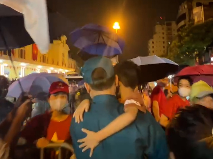 Alors qu'il etait en mission de protection de la delegation de defile militaire M. Nguyen Truong Hai - un milicien volontaire - a decouvert une femme portant un jeune enfant dans ses bras et demandant avec panique a l'aide.