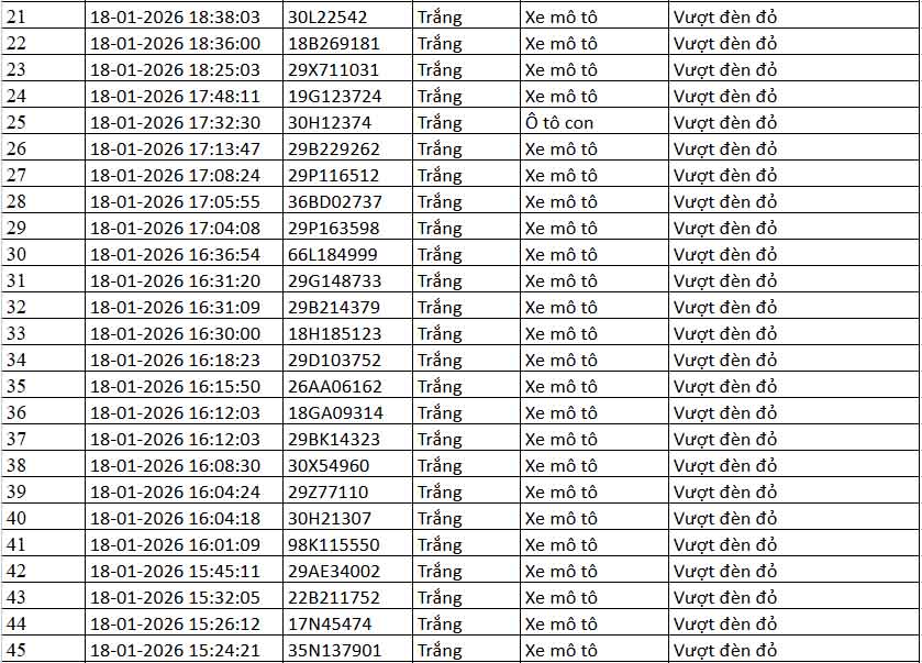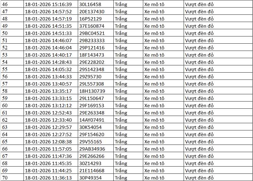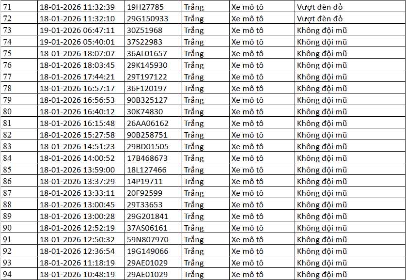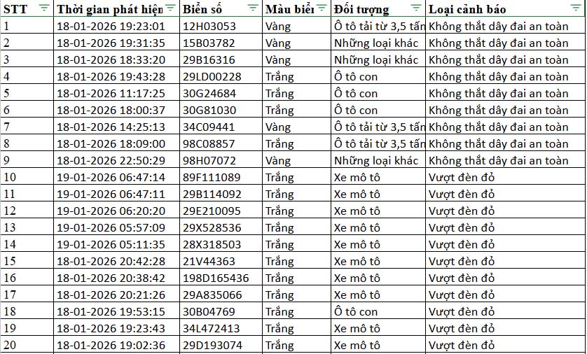 Le 20 janvier, des informations du Departement de la police de la circulation (CSGT) - Ministere de la Securite publique ont indique que pendant la periode allant de 12h00 le 18 janvier a 12h00 le 19 janvier, le systeme de cameras d'application de l'intelligence artificielle (IA) exploite par cette unite a enregistre une serie de violations de l'ordre et de la securite routiere dans la region de Hanoï et sur l'autoroute Noi Bai - Lao Cai.