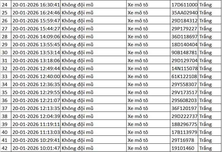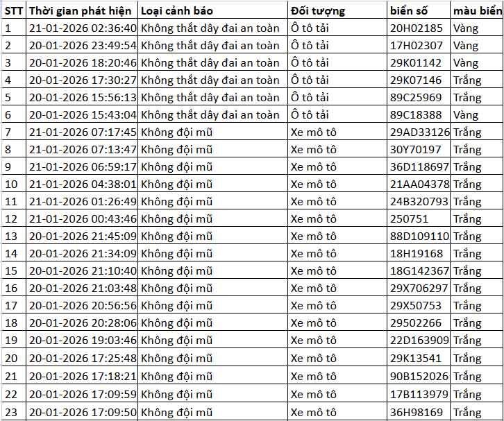 Le 22 janvier, des informations du Departement de la police de la circulation (CSGT) - Ministere de la Securite publique ont indique que pendant la periode allant de 12h00 le 20 janvier a 12h00 le 21 janvier, le systeme de cameras d'application de l'intelligence artificielle (IA) exploite par cette unite a enregistre de nombreux cas de violations de l'ordre et de la securite routiere dans la region de Hanoï et sur l'autoroute Noi Bai - Lao Cai.