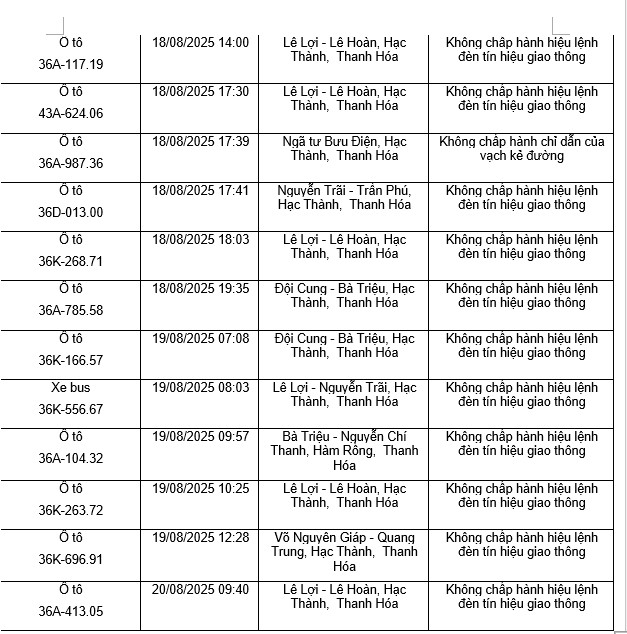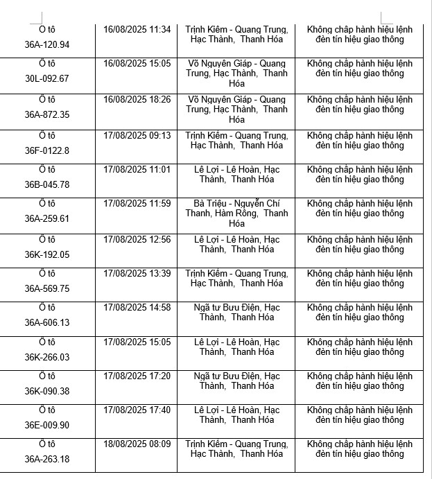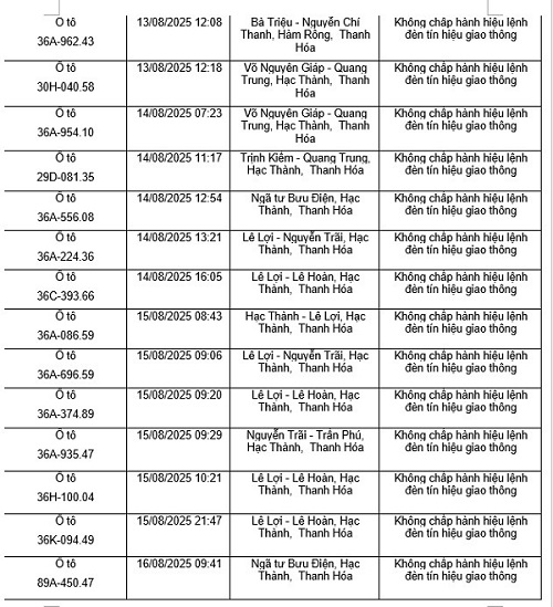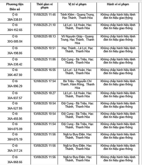 Le departement de la police de la circulation de la province de Thanh Hoa informe que les vehicules en infraction au code de la route ont ete detectes par le biais d'un systeme de cameras de surveillance de la securite et de l'ordre et de la securite routiere dans la region du 11 août 2025 au 20 août 2025. Parmi eux il y a des proprietaires de voitures en infraction au depassement du feu rouge comme suit :